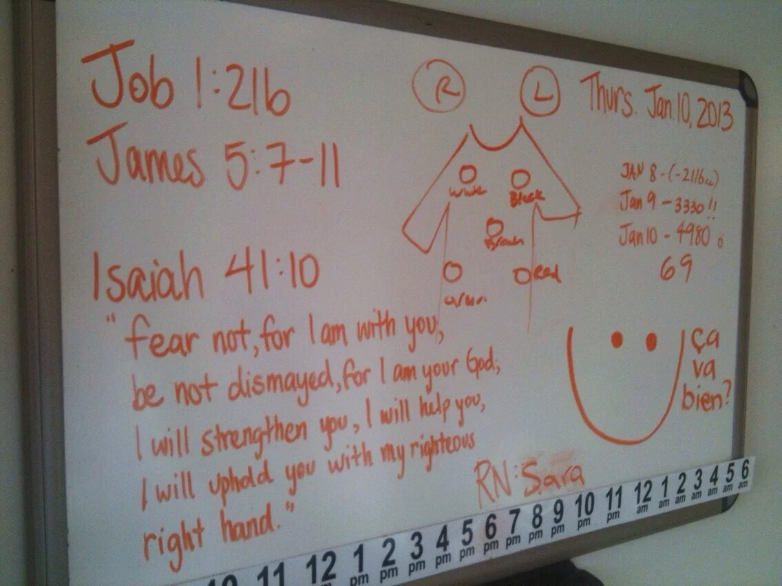 I filled the whiteboard in my room with encouraging reminders. The bible verses kept me focused on truth, the lead picture allowed me to attach my own heart monitor, the smile reminded me of wonderful friends, and the number stats show that the water was moving out fast - I lost 40lbs in 3 days! Crazy.