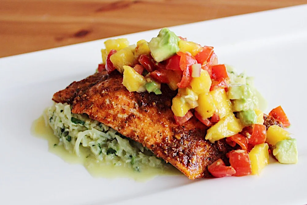 Salmon with mango avocado salsa and cilantro-lime-coconut cauliflower rice