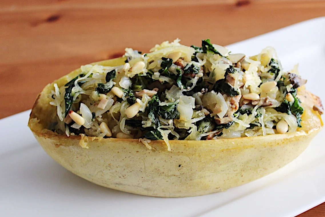 I’ll often cook the spaghetti squash sometime in the morning or a day before. I like to throw a chicken breast into the mix as well. It works to use spinach instead of kale. Brooklyn loves eating out of the shell!