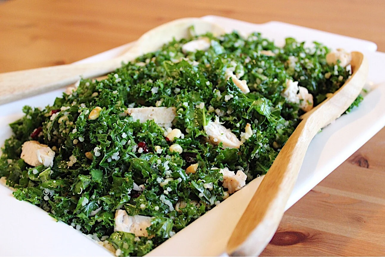 One of my favourites. When you buy your kale, make sure you use it within the first couple of days or it will go wilty. It’s also imperative that you massage the dressing into your kale and let it sit for the 10min. I prefer pine nuts over the slivered almonds and I skip the parmesan (but everyone else gets it on their plates).