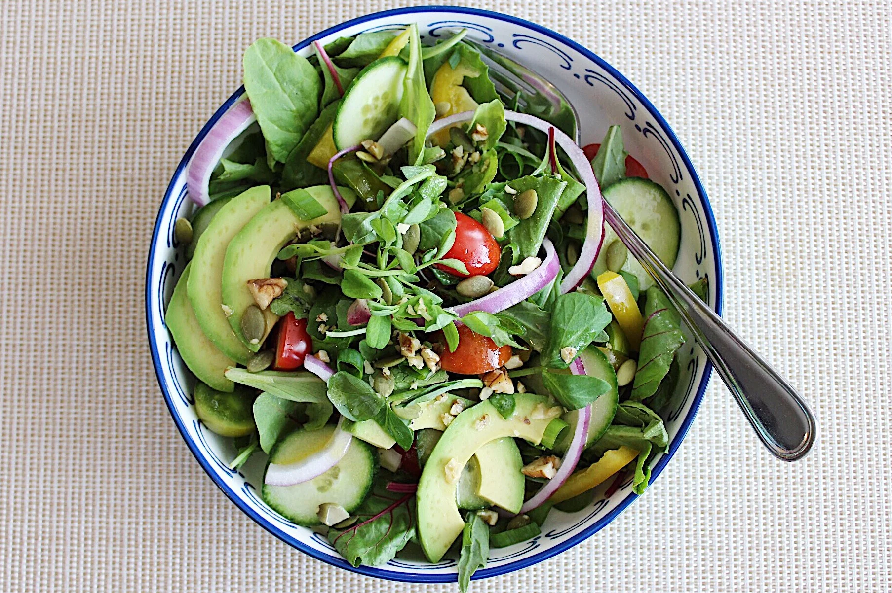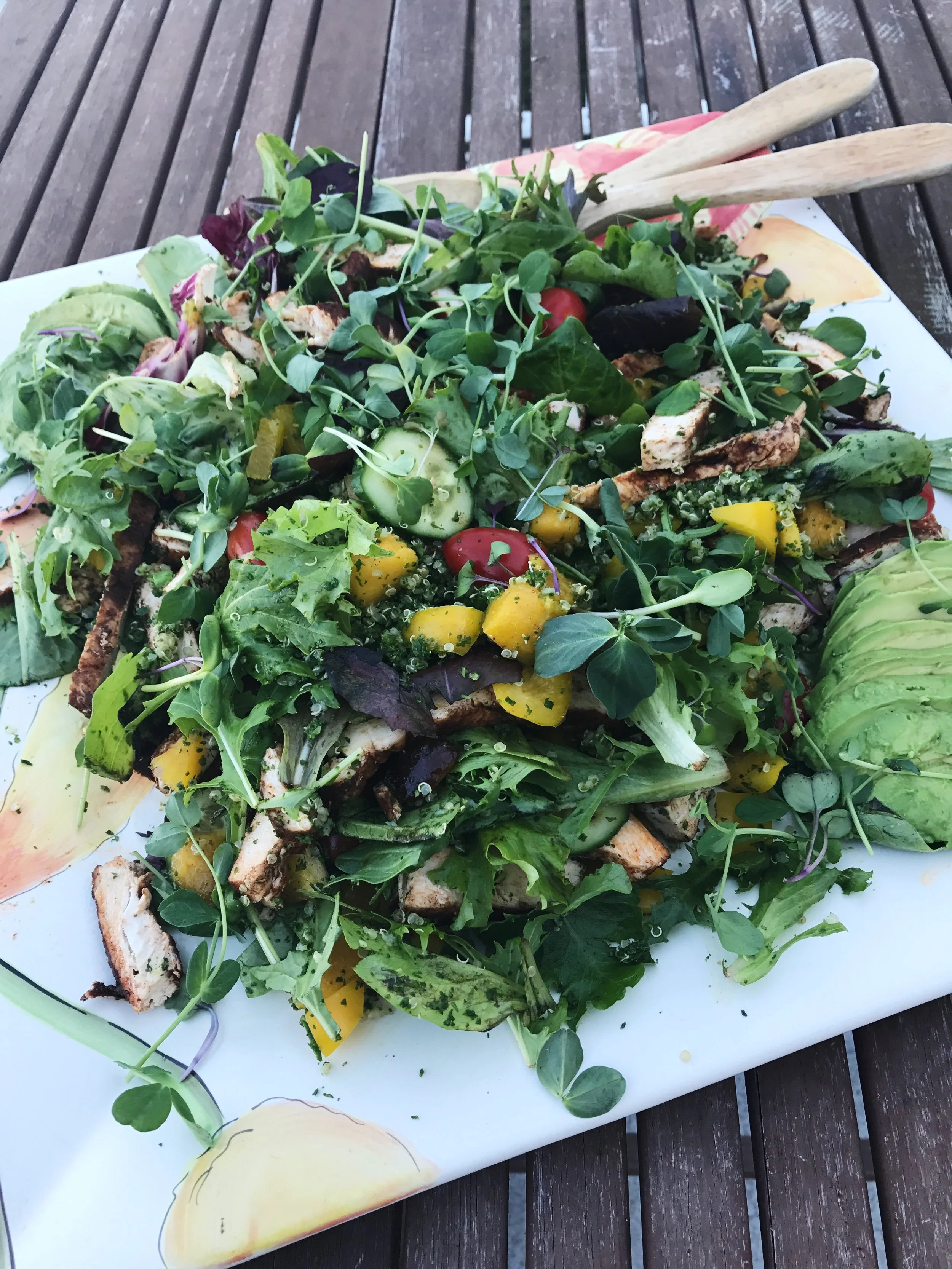 I like to throw in veggies like arugula, tomatoes, cucumber, avocado, bell pepper, micro greens, and red onion (pre-soak in a bowl of water to mellow the flavour a bit) as well as walnuts and pumpkin seeds. My favourite vinaigrette is from Against All Grain.